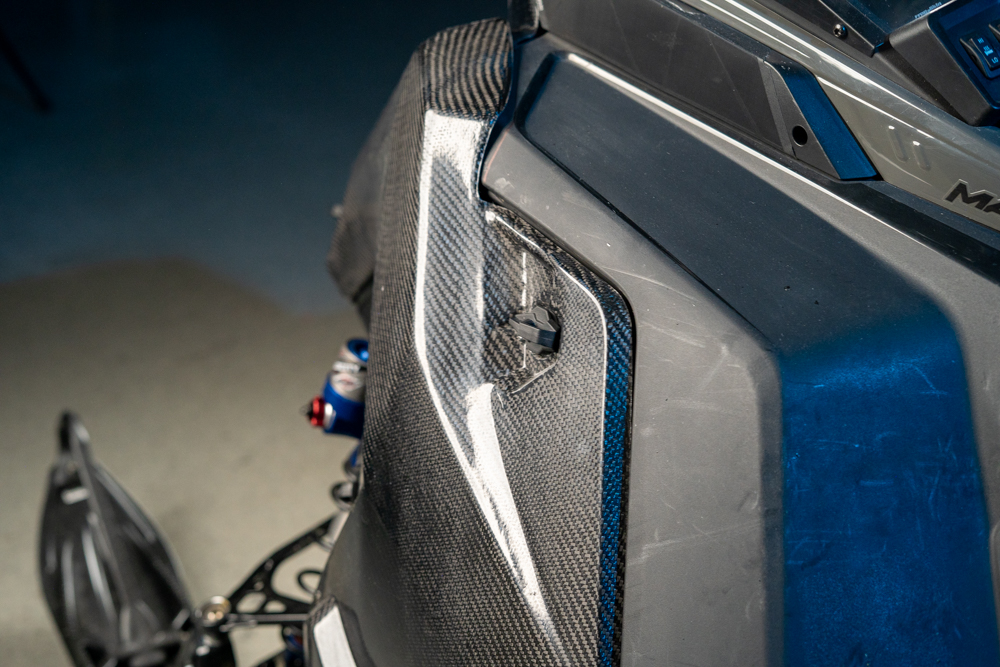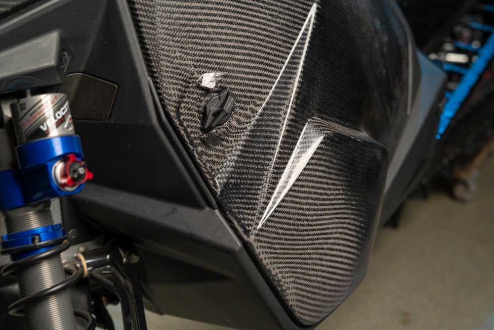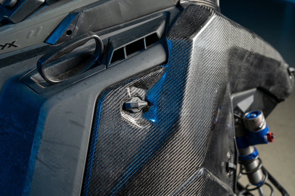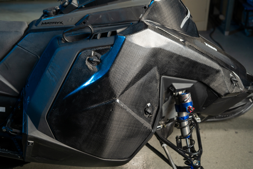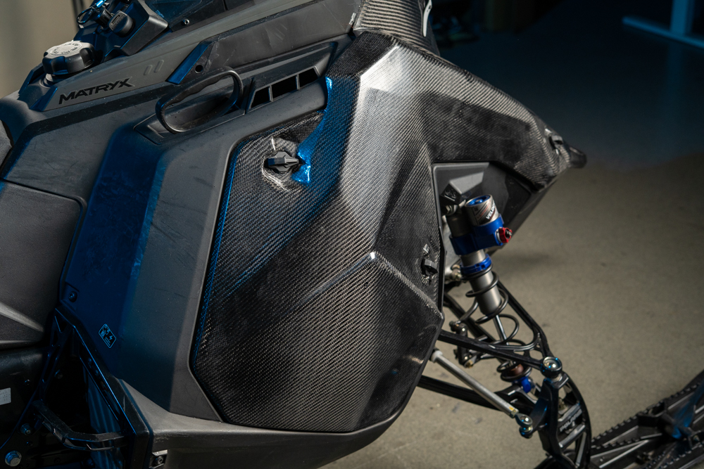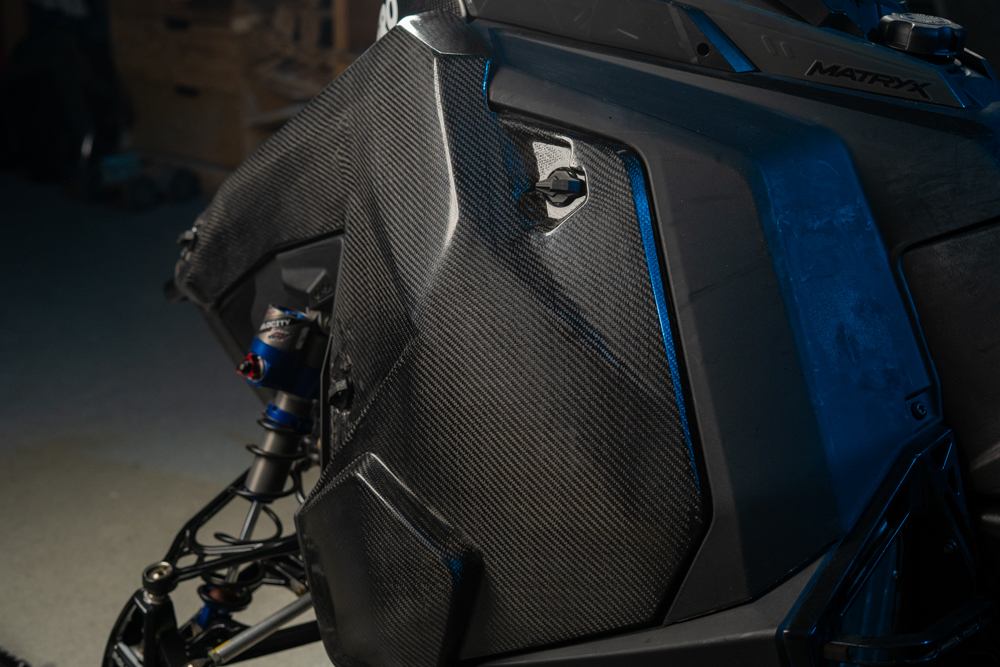 Introducing the lightest carbon fiber side panels for the Polaris Matryx snowmobile. Fabricated with new resin technology to allow the panels to flex slightly, yielding an unbelievably light part that will withstand abuse from aggressive riding. Each panel weighs just one pound, saving over five pounds total when replacing the stock plastic Polaris side panels. Stock 1/4 turn latches, grommets, and washers are reused on the new panels. The upper portion of the panel has been shaved down ~1/2″ top and side to make the sled even more low profile.