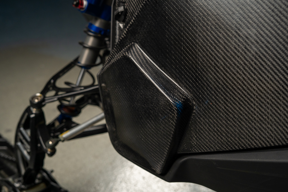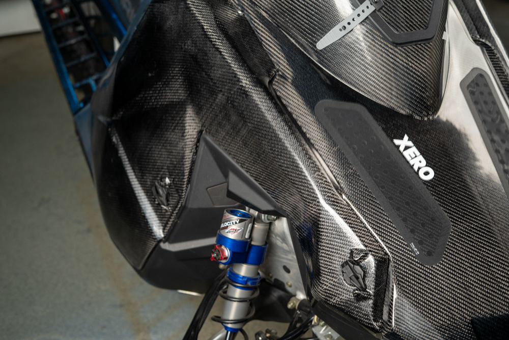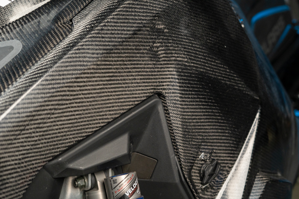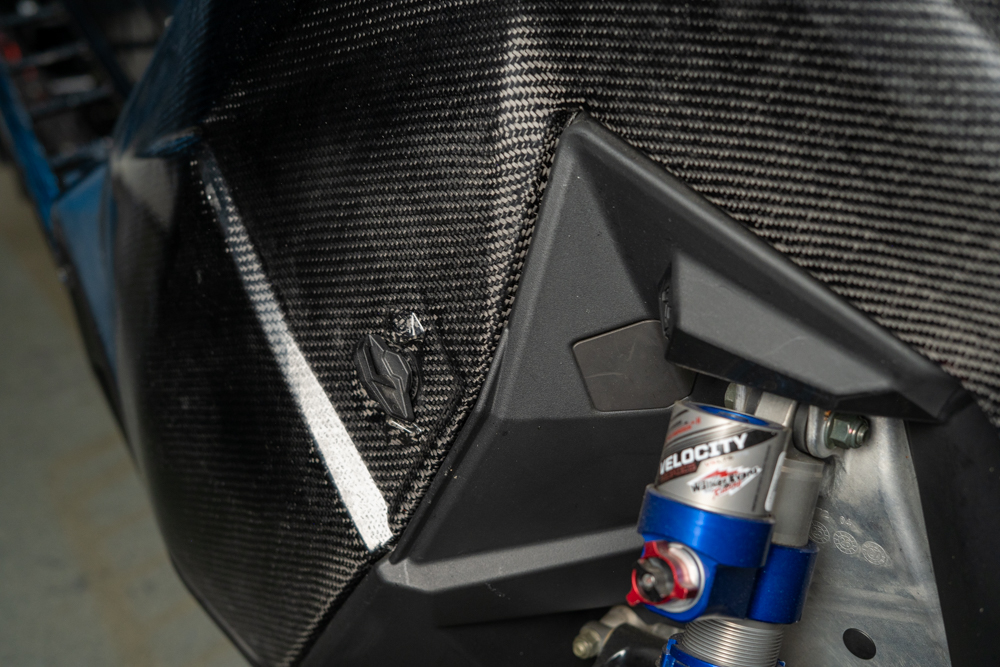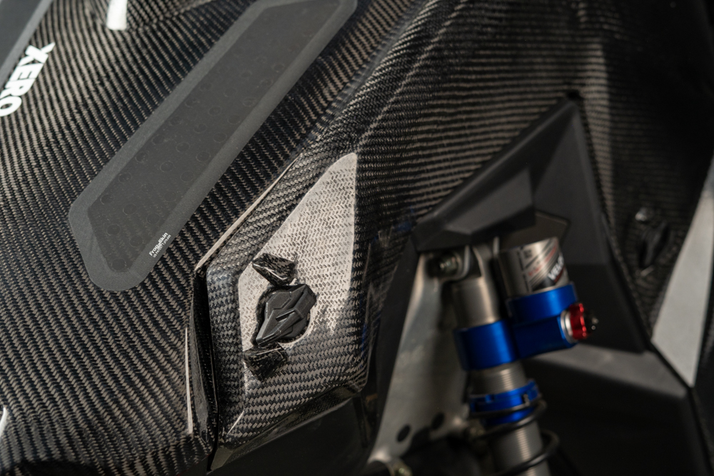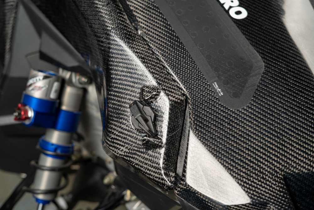 Introducing the lightest carbon fiber side panels for the Polaris Matryx snowmobile. Fabricated with new resin technology to allow the panels to flex slightly, yielding an unbelievably light part that will withstand abuse from aggressive riding. Each panel weighs just one pound, saving over five pounds total when replacing the stock plastic Polaris side panels. Stock 1/4 turn latches, grommets, and washers are reused on the new panels. The upper portion of the panel has been shaved down ~1/2″ top and side to make the sled even more low profile.